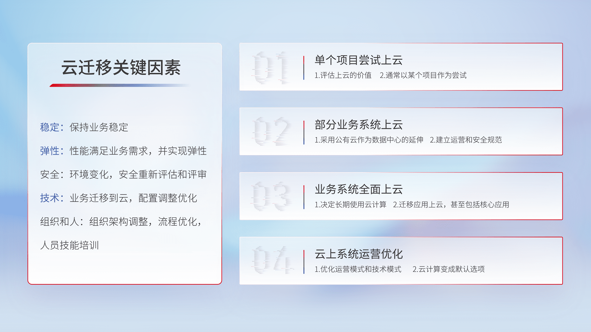 结合实际业务,,,从规划设计、、、云平台选型、、云原生改造、、、、数据迁移、、集成交付,,迁移全过程为客户识别最佳上云路径,,,,做好风险识别管理,,设计网络架构、、、身份权限、、、安全审计合规、、操作审计、、、日志审计、、、、监控告警策略、、、多站点容灾设计等,,,对云上基础设施进行整体规划,,,,提升IT治理水平,,以满足弹性、、、、高可用、、、高性能的需求。。。